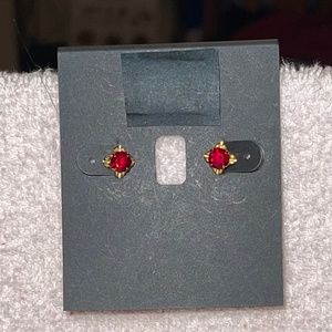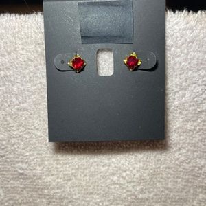 Lab created ruby stud earrings set in goldtone. With a little pretty design around the stones.