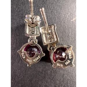 Pinkish purple color shifting lab created sapphire / ruby round gemstones prong set in a rhodium plated over sterling silver setting. White accent stones are topaz. Disc ear backs are not original. 925 PAS THAI