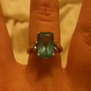 Lab-Created Topaz with tiny diamonds on each side. Size 5. I received it as a gift and its time to part with it. I only wore it once to a wedding. No scratches on band. Gorgeous!!! It was purchased from Marks & Morgan.