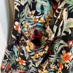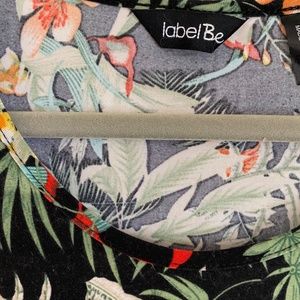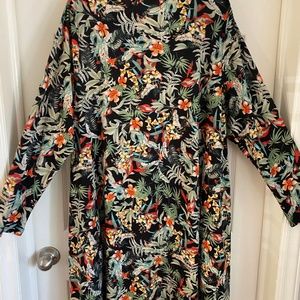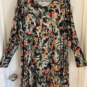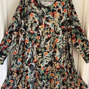 Long sleeve, tropical print dress from Label Be, W24, polyester blend, scoop neck, mid-length, 39" from back of neck, 27" across bust, full hips, front slouch pockets.