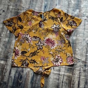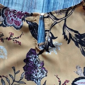 Beautiful dress/casual Label Rachel Rachel Roy top. Mustard yellow colored with flowers and leaves in colors of purple, burgundy, cream, black and white. Key hole detail on the back top and tie front at the bottom detail. Size L measurements are about armpit-armpit 21 inches and top-bottom about 24 inches. In excellent condition !