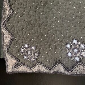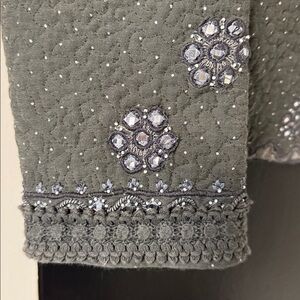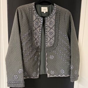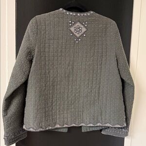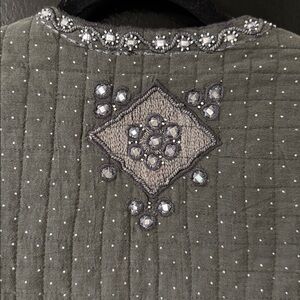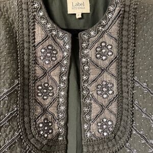 Ritu Kumar jacket is a gray, collarless, embellished women's garment featuring intricate beadwork and embroidery.