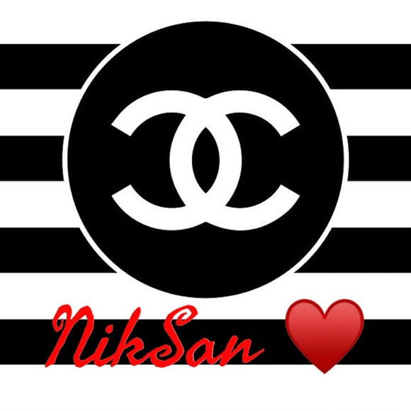 High-contrast black and white Chanel logo on bold stripes. Red scripted text and heart accent add pop. Simple, graphic, and stylish.