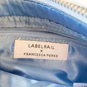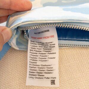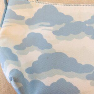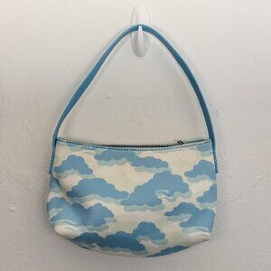 Stay stylish and unique with this Labelrail x Francesca Perks cloud print shoulder bag. Features soft blue and white cloud graphics on a satiny polyester shell with matching sky blue interior. Single zip closure, inner zip pocket, and short handle strap for chic handheld or shoulder wear. One minor spot near the bottom (see photo).