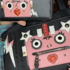Unique Prada bags featuring a playful robot face design. Black and pink color scheme with eye-catching details.