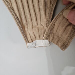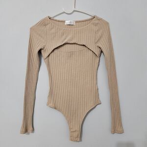 Labiz Bodysuit Womens Small One-Piece Ribbed Knit Cut Out Long Sleeve Beige