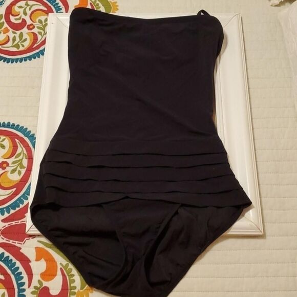 La Blanca by Rod Beattie black one piece swimsuit, can be worn strapless or with halter style strap, tiered at waist, shelf bra, size 8, Excellent pre loved condition, measurements in pics, smoke free home, ships next day. Bundle and Save!
