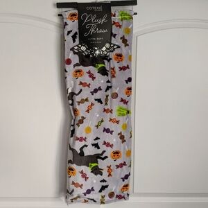 Super soft plush throw blanket. Grey background features Labradors chasing bats, Boston Terriers Frenchies riding brooms, and assorted Halloween goodies (candies, pumpkins, lollipops) printed in multicolors.