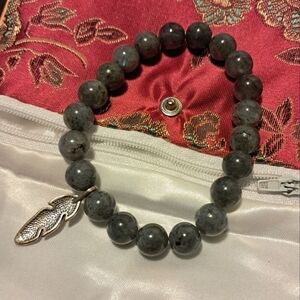 Labradorite Beaded Bracelet W/ 925 Sterling Silver Feather Charm.