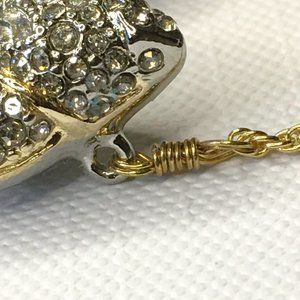 From the Lovebirds collection, Gold-tone and silver-tone rope chain necklace with adjustable lobster clasp closure. Romantic crystal encrusted pave lovebirds pendant featuring labradorite doublet stones and semi-precious stones. AB mark on clasp. Check out the video that shows the cute dangling stone!