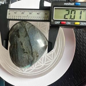 A chunky heart-shaped carving of labradorite gleams with iridescent hues, captivating the eye with its mysterious play of colors. Though marred by a minor chip at the bottom apex, its metaphysical properties remain potent. Labradorite is renowned for enhancing intuition, promoting spiritual awakening, and protecting against negative energies. This enchanting crystal encourages self-discovery and inner strength, making it a cherished companion for those seeking transformation and insight.