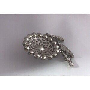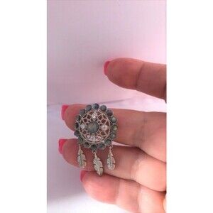 Beautiful Labradorite Dream Catcher Pendant. Setting is silver-plated. Measures about 1 3/34 inch from top top bottom of the longest feather. Very flashy Labradorite stones. Larger Labradorite in center is accented with 4 white crystal stones and the 16 smaller labradorite stones surround it. Bottom has 3 feather accents. Hidden bale in the back.