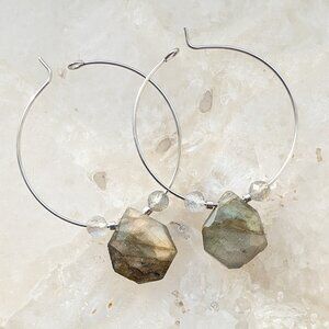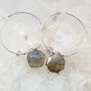 These handmade hoop earrings are for pierced ears. The stainless steel hoops are selected for their ( more so ) hypoallergenic and sturdy qualities. This pair features gorgeous Labradorites in various sizes and rustic and organic cuts and facets. Beautiful shine and flashing in greens and blues with a bit of greenish golden iridescence. Labradorites are a Feldspar and semi-precious stone.