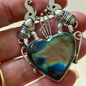 This exquisite 3.2” pendant features a heart-shaped labradorite, renowned for its mesmerizing play of colors, set in 925 sterling silver with intricate detailing. At its center, a delicate elephant motif, symbolizing wisdom and strength, adds a touch of cultural elegance. Handcrafted by skilled artisans, this necklace blends natural beauty with timeless design, making it perfect for both everyday wear and special occasions.