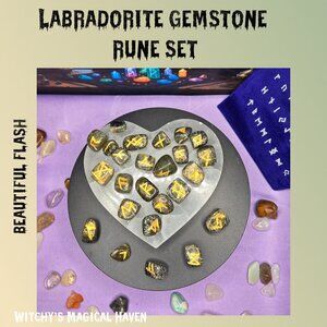 Labradorite gemstone rune set is a mystical tool of divination, transformation, and inner vision. 100% genuine gemstone, variations in size, shape and color are expected. Lots of beautiful flash.