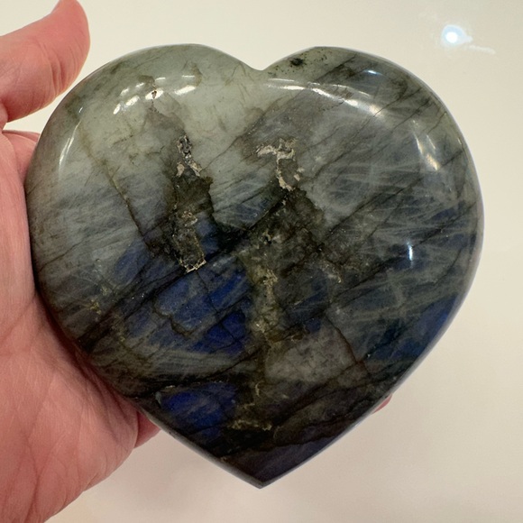 Beautiful labradorite heart with blue flash. Comes with stand. 4 inches.
