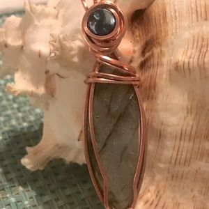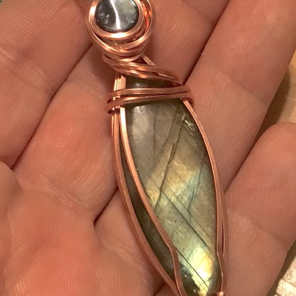 Gorgeous green flash labradorite pendant with abalone accent wrapped in 99% pure copper One of a kind