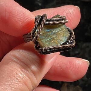 Size 7..genuine labradorite. Very unique, one of a kind. Labradorite connects you to spirituality and copper is great for arthritis. Has naturally oxidized with time.
