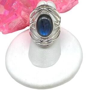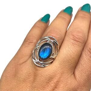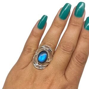 Stunning! Genuine blue fire flash labradorite natural stone statement ring. Solid sterling silver and stamped 925. Size 6. Such a fun piece to add to your collection!