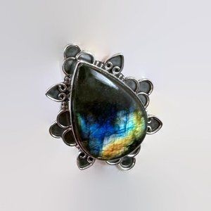 Wow! This is a stunning, large vintage sterling silver ring! It has a large, teardrop shaped glowing labradorite stone that shines with incredible golden greens and blue in the light when you turn it. I am always very picky when I choose labradorite stones as I want them to have beautiful fire. The stone is set into a bezel. A fun, ornate string backplate has loops and curled wired. Unique ring! Beautiful statement for your finger! This is a unisex piece and can be worn by a man or a woman.