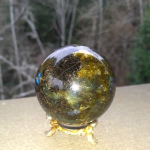 Labradorite sphere with bright blue and gold flashes. It's also very sparkly as you turn it. I've always thought that Labradorite spheres look like little Planets with lightning storms as you turn them. There's always something cool to see. I used my camera flash in the video. The sphere is very dark unless in bright light. It's an incredibly beautiful crystal. My favorite, in fact. I'm not sure how to measure size, so I used a quarter in the image above for size reference. (Stand is not included.)