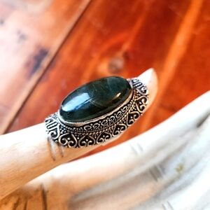 This elegant ring features a stunning green stone set in a beautifully detailed silver band. Perfect for adding a touch of sophistication to any outfit.Elegant ring with intricate detailing. Perfect for adding a touch of sophistication to any outfit. Ring is a Base metal- won't tarnish. Only one available. See pictures and video for more information on measurements and other details.