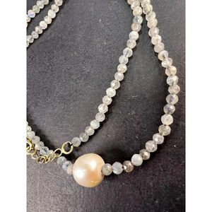 2mm faceted labradorite beads with a 10mm white cultured pearl in the center. Sterling silver lobster clasp with extension. Measures 18 inches in length