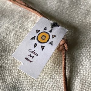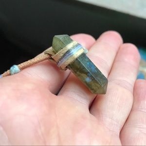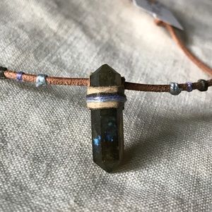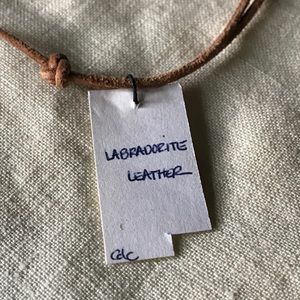 New and unworn. Unusual combination of materials includes leather, embroidery thread, and a beautiful polished labradorite crystal. Leather thong is adjustable. Made by Cobus Art Wear in Vermillion Cliffs, AZ.