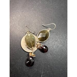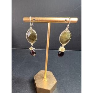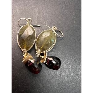 Genuine labradorite and rhodolite gather teardrops artisan made with sterling silver. I looked all over and didn’t find any purity stamps but I did acid test to verify that it’s 925 sterling silver on the ear wires , wrapped wire and spacer discs. These have been gently cleaned and ready for their new home.
