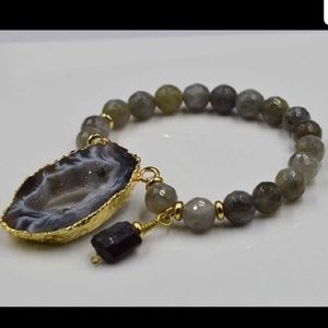 Labradorite beaded (8mm) bracelet with a gold plated geode agate slice and black tourmaline charm. The beads are strung on an elastic band. Size and shape of the agate and tourmaline may vary as they are natural stones.