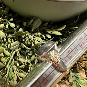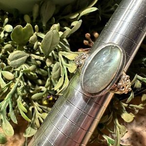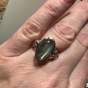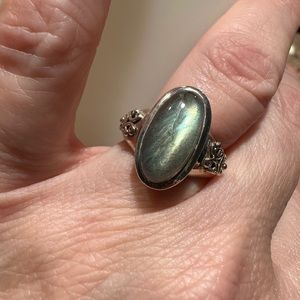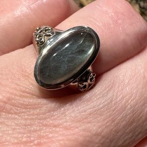 This gorgeous ring by Doug Paulus set in sterling silver. Your Nate design on the sides sets off this gorgeous, oval stone. This ring is a size 7. You’re gonna love this piece!
