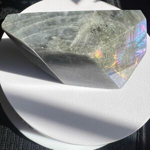 A labradorite crystal freeform stone with a vibrant blue, purple , yellow, orange flash is a mesmerizing piece, reflecting deep shades of azure and indigo. This captivating gemstone is believed to enhance intuition, protect against negativity, and foster transformation, offering a sense of calm and clarity.