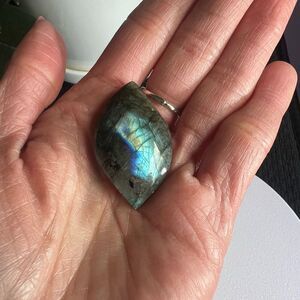 This Labradorite crystal teardrop meditation stone, perfect for a pendant jewelry making if desired. Shimmers with iridescent hues of blue, green, and gold. Renowned for its metaphysical properties, it enhances intuition, protects against negativity, and promotes transformation. Adding a necklace creates a beautiful and powerful piece of jewelry.