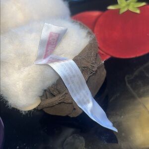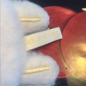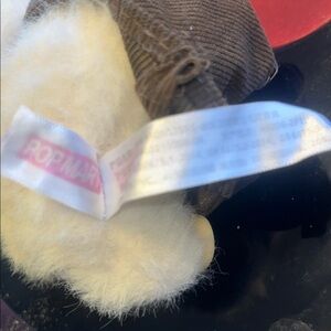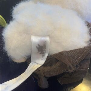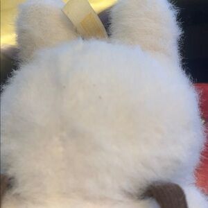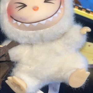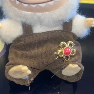 The Monster plush with soft white fur. Dressed in stylish brown overalls. Ideal for gifting. Gently played The Monster Authetic check feet, Ears and teeth.