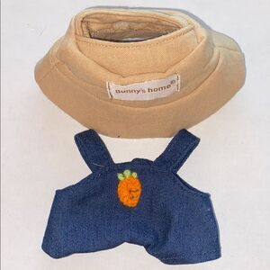 Adorable tan visor and blue denim overalls set from . Perfect for adding a cute touch to any outfit. Features a charming carrot design on the overalls.