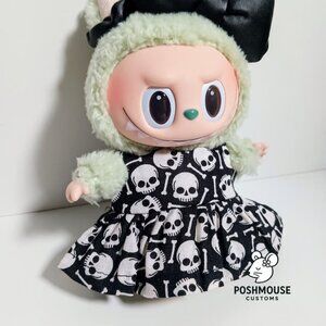 Handmade Labubu Halloween skeleton dress with faux leather bow created to fit Pop Mart Labubu dolls including Macaron, Have a Seat, The Monsters and Big into Energy series. This spooky outfit is made with custom fabric to bring festive Halloween style and collectible charm to your Labubu display.