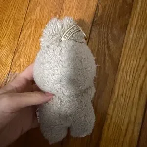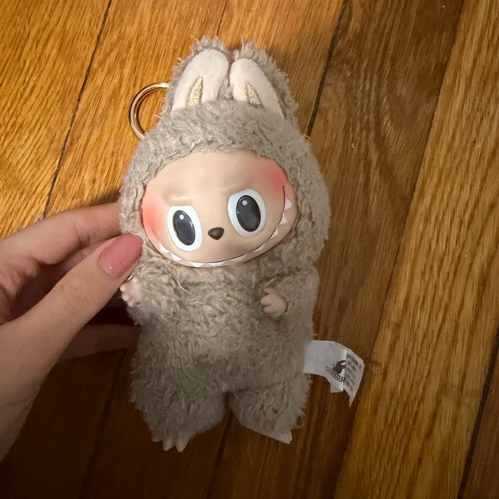 Cute plush keychain doll. Soft light gray fur with a blushing face and large eyes. Gold-accent ears and small hands and feet. Fun collectible accessory.