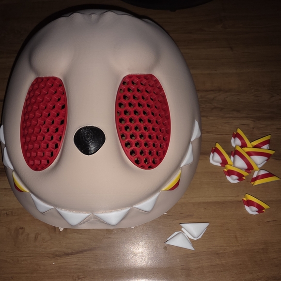 Eye-catching Labubu mask featuring bold red and white accents. Perfect for costume events. includes two sets of teeth