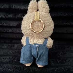 Labubu blue jeans Halloween overalls outfit. Grey cat with orange pumpkin emblem. Labubu not included!