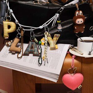 These danglers have a letter, small Labubu, tassel and rabbit clip.