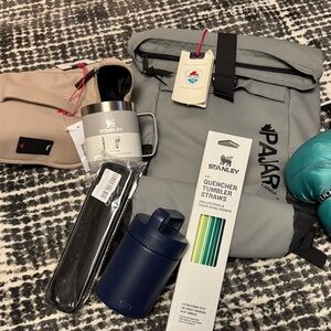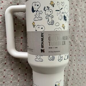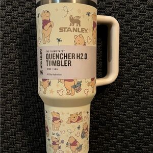Vibrant Stanley tumbler featuring playful character design. Includes a pink handle and lid.