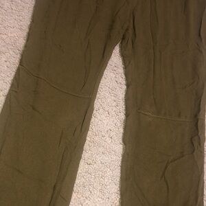 Lacausa Willow Tapered Leg Rayon Slim Casual Pant Olive Green Large. Elasticized waist. Front slant pockets. Semi sheer fabric. Casual trousers in a lightweight breezy rayon. The perfect chic loungey look to take you from day to night. Approx measurements: 14.25“ rise, 26.5“ inseam, & 16“ waist. Great pre-owned condition. Please note loose thread and fade to fabric as shown. Stock photo from Revolve for styling only. Smoke/pet free home. Offers welcome. Bundle & save. Ship same/next day. Packaged w/ care.