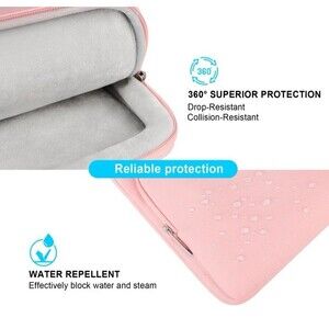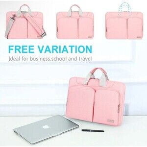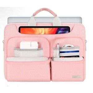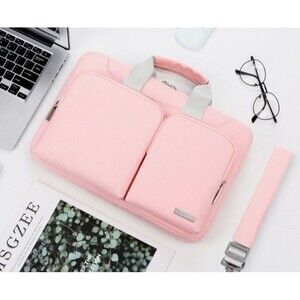 13-13.3 INCH LAPTOP SHOULDER BAG SLEEVE CASE FOR SMALL LAPTOPS AND MACBOOKS. VERY PROTECTIVE INSIDE. COLOR IS LIGHT PINK. COMES WITH CARRYING STRAP AND HANDLES, LOTS OF POCKETS INCLUDING OUTSIDE POCKETS ON EACH SIDE PLUS TWO ZIPPERED COMPARTMENTS ON ONE SIDE WITH LITTLE POCKETS ON THE INSIDE OF THOSE FOR CABLES AND POWER BRICK. VERY PROTECTIVE. OUTSIDE IS WATER REPELLENT. PLEASE MEASURE YOUR LAPTOP TO MAKE SURE THIS WILL BE THE CORRECT FIT. I AM NOT SURE WHAT MODELS WILL FIT AND WHICH WILL NOT. OUTSIDE MEASURES A LITTLE OVER 14" WIDE AND 9.5" TALL. INSIDE MEASUREMENTS WILL BE SLIGHTLY SMALLER BECAUSE OF THE PADDING. STORED IN A SMOKE-FREE ENVIRONMENT.