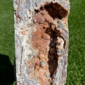 Lace agate tower with druzy and bubbles. Approx 7.75” x 3.25” x 3”. Weighing a chunky 5lbs. Tip is not perfect/not sharp.