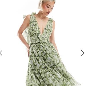 Lace & Beads Bridesmaid Madison bow shoulder midi dress in olive floral