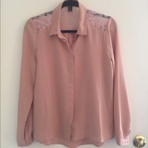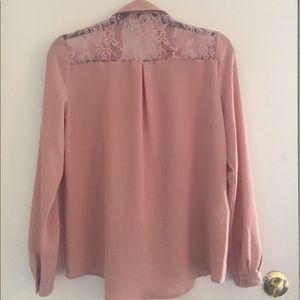 Size S US, flattering peach blush blouse with lace detailing on the shoulder. Buttons are hidden. Polyester and nylon material. Lace detailing on cuffs. Lots of air flow. Worn once. Washed once.