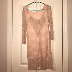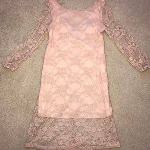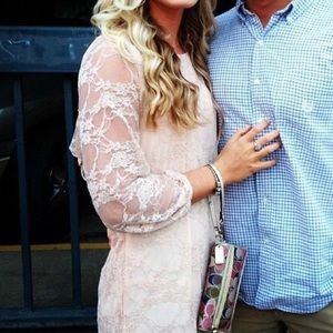 Lace sleeves and overlay, scoop back with bow. Worn once to a wedding.