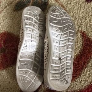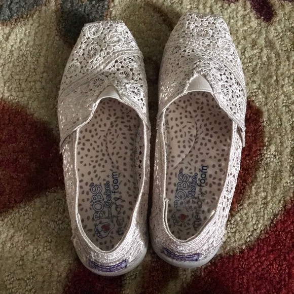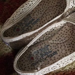 Cream colored lace Bobs. Only worn once for a wedding. There are just a little too tight for me. Memory foam bed makes these super comfortable. Bottoms show wear from being outside during pictures.