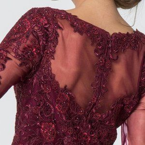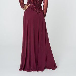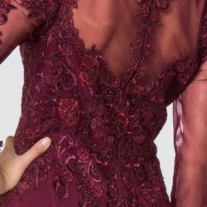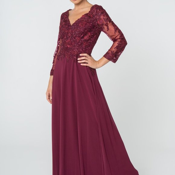 Long Formal Evening Dresses with v-neckline, long illusion sleeve dress, sheer back with zippered closure, a-line shape