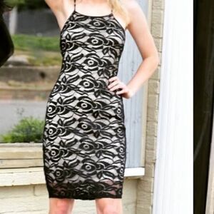 Lace Bodycon Dress. Features nude base covered by gorgeous black lace. Combined with unique back criss cross ties this dress is perfect for date night or a party. Pics with measuring tape are size M.